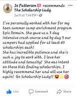 "I've personally worked with her for my teen summer camp enrichment program Epic Domain. She gave us a 3 day intensive crash course and by day 3 our campers had applied for at least 40 scholarship each! She has incredible patience and she is such a joy to work with. I love her attitude and tenacity! She was intent on those kids finding scholarships. I highly recommend her and will use her again! Go Scholarship Lady!!"