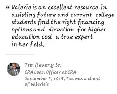 "Valerie is an excellent resource in assisting future and current college students find the right financing options and direction for higher education cost a true expert in her field.
