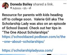 "Resource for parents with kids heading off to college soon. Valerie Gill aka The Scholarship Lady was also on an episode of School Dazed. Check out her tips in "The One About Scholarships"